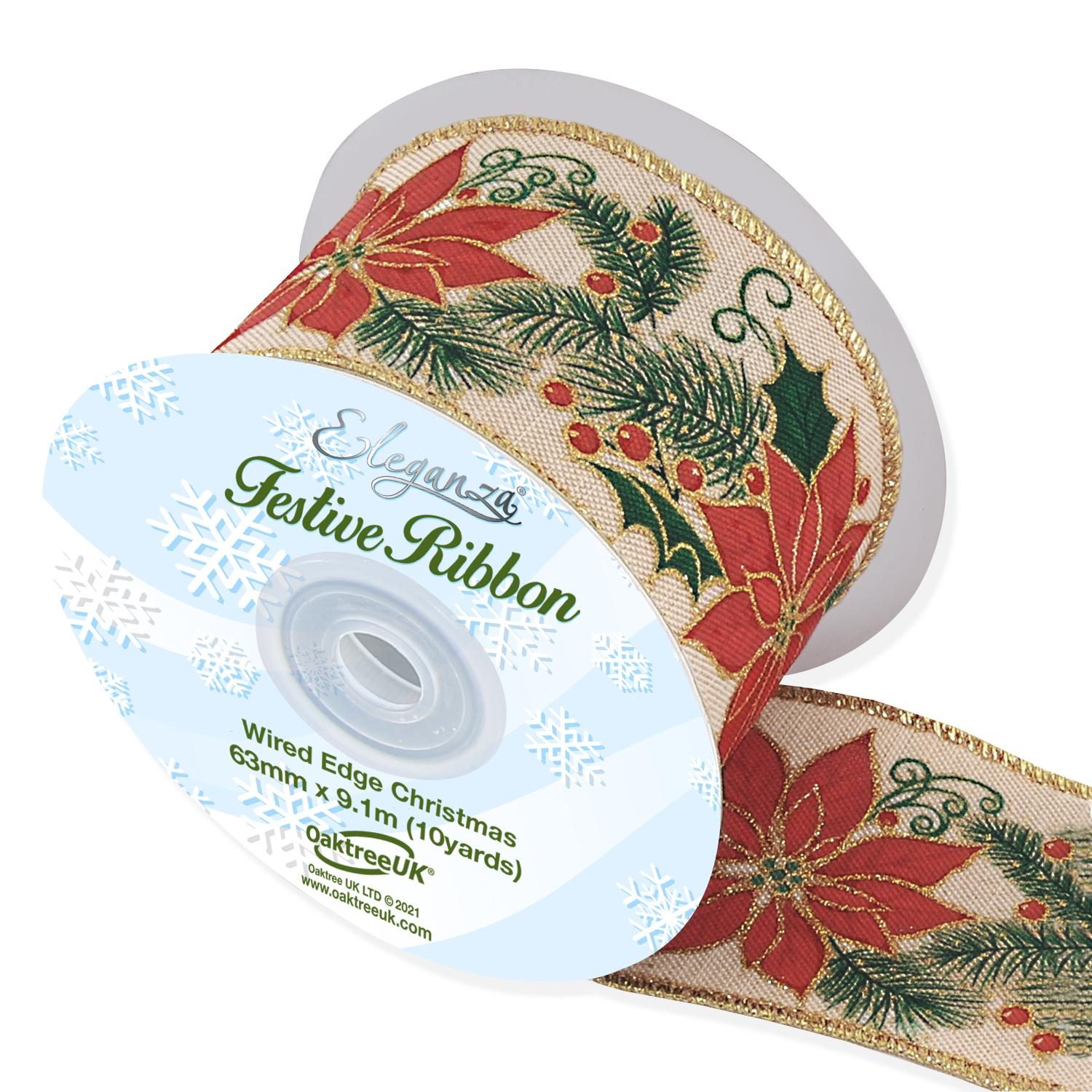 Eleganza Wired Edge Christmas Glitter Edge Poinsettia No.383 Natural 63mm X 9.1m
